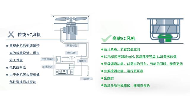 傳統(tǒng)AC風(fēng)機都具有重型的電機和變速箱,這樣的設(shè)計顯得很笨重,增加了施工的難度,電機的效率也很低,并且大型的電機等機械組件還會造成風(fēng)機的振動,很影響冷卻塔的工作效率。而空調(diào)冷卻塔風(fēng)機采用的是綠色科技EC電機,這種設(shè)計更加緊湊,并且節(jié)省安裝的空間。EC電機效率遠超普通大型電機90%,并且還具備無級調(diào)速功能,在節(jié)能的同時,工作噪音更低,安裝維護更便捷,使用壽命更長。